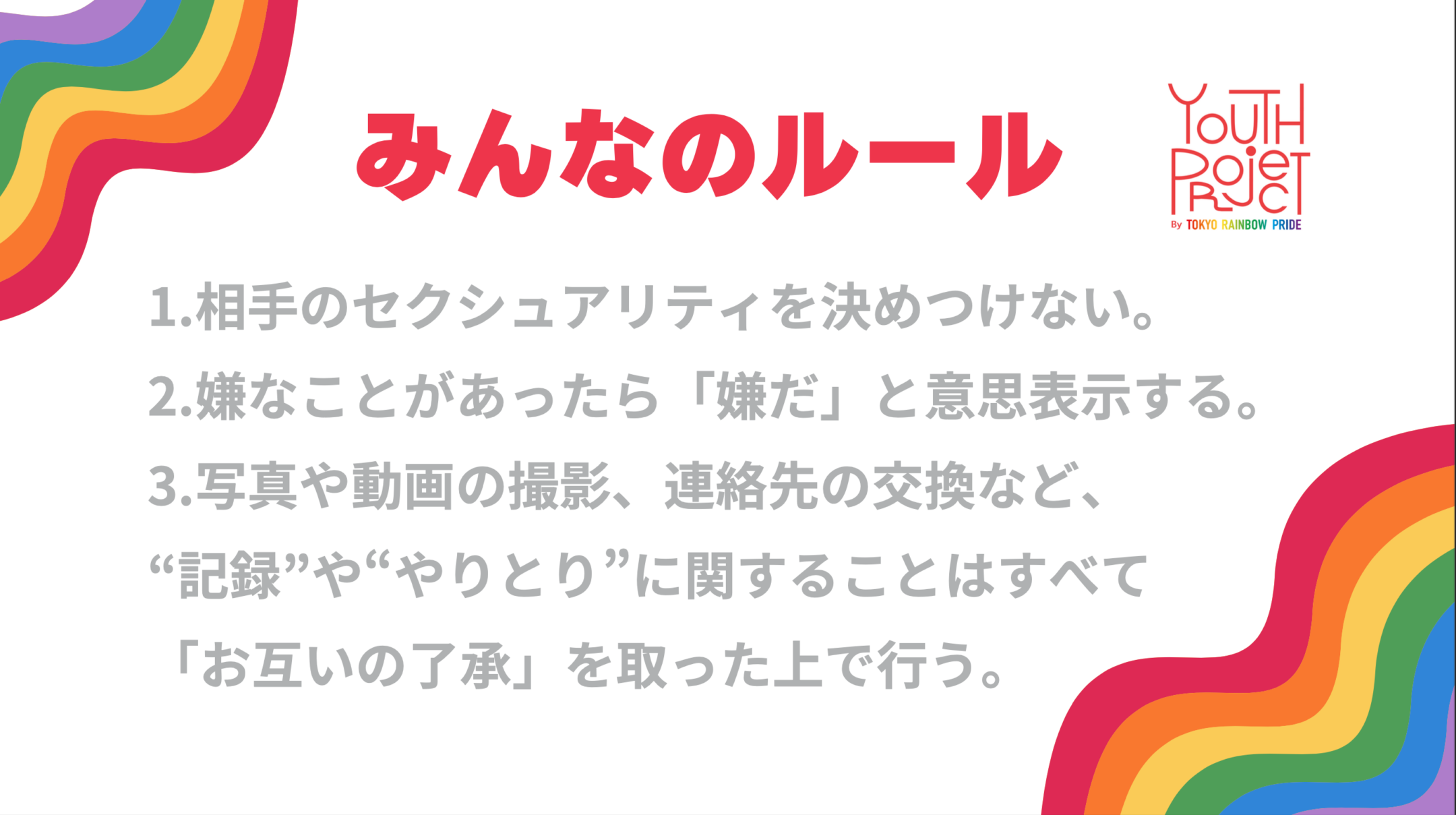 対象は10代・20代のLGBTQ+当事者やアライです。本名やセクシュアリティを問わず、呼ばれたい名前・ありたい自分で参加していただけるようにしています。