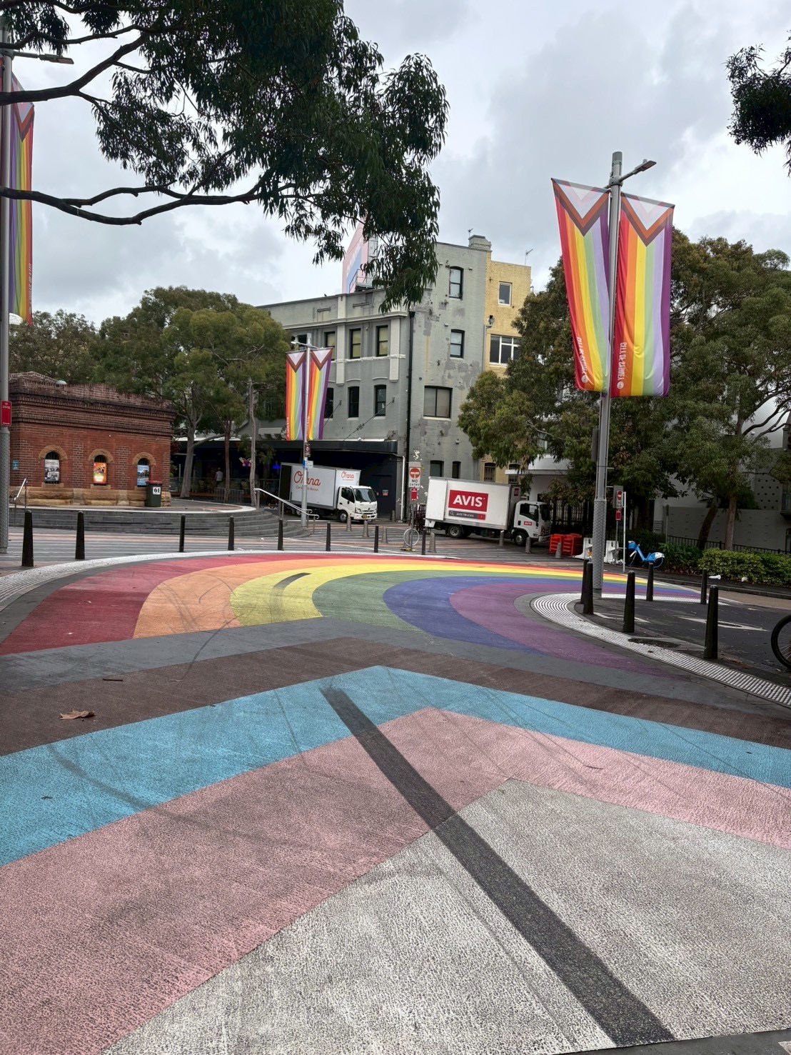Oxford Streetは、オーストラリアのクィア解放運動の歴史的場所。パレードの中心地。道路はプライドフラッグ色に装飾されていた。