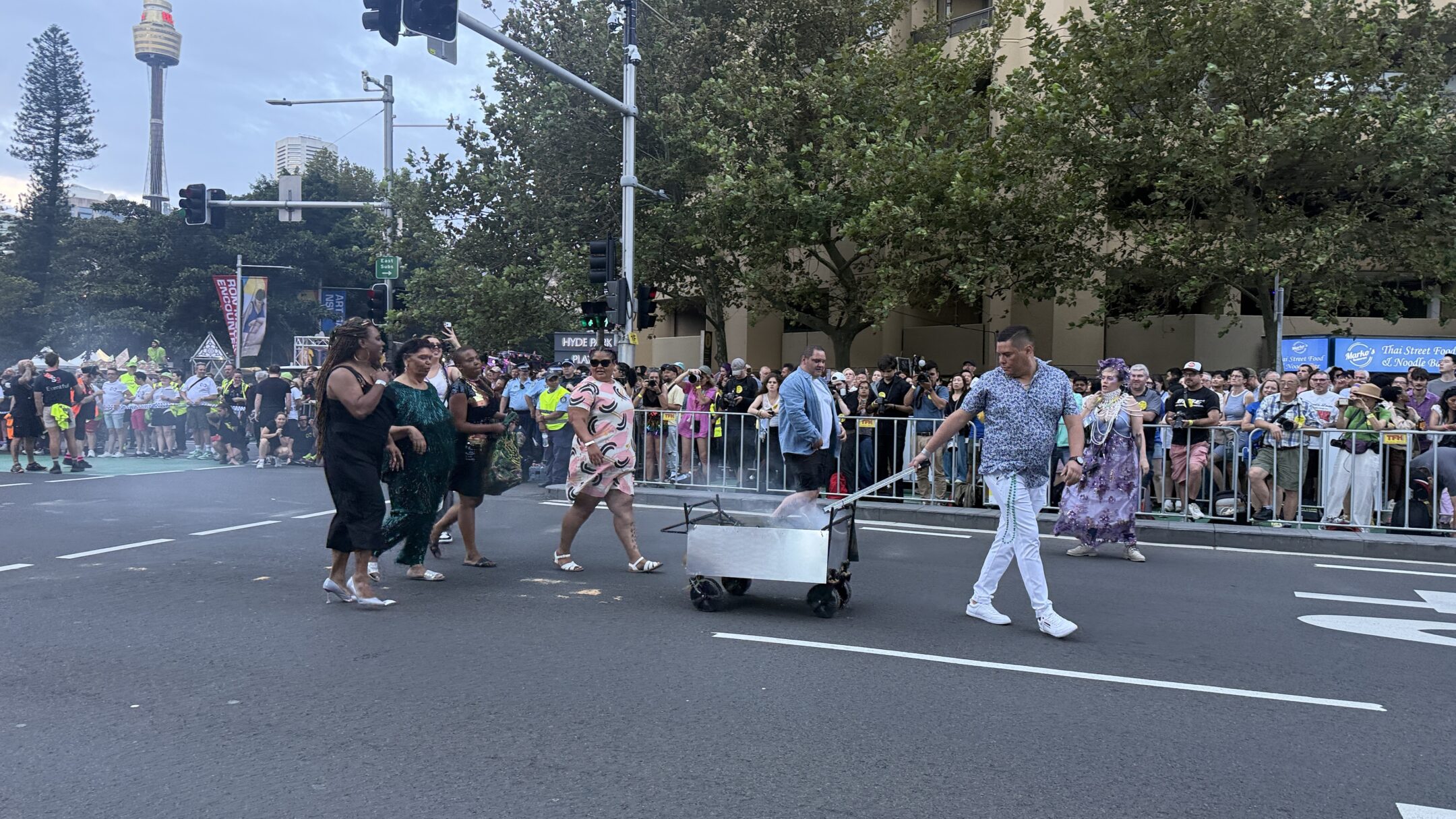 2026年のパレードでは、174のフロートと約9,000人の参加者が行進し、沿道には約10万人の観客が集まりました。パレードは、先住民コミュニティによる「Welcome to Country」とスモーキング・セレモニーから始まり、その土地の歴史と文化への敬意を示す形で幕を開けます。オーストラリアでは多くの公式行事が先住民コミュニティによる歓迎の儀式から始まりますが、Sydney Gay and Lesbian Mardi Grasでは、先住民コミュニティとの対話を経て、レズビアンのバイクグループ「Dykes on Bikes」が先頭を走り、その後にFirst Nationsのフロートが続く構成となっています。これは、バイクの音が邪気を払うという文化的な意味合いも踏まえたものだそうです。